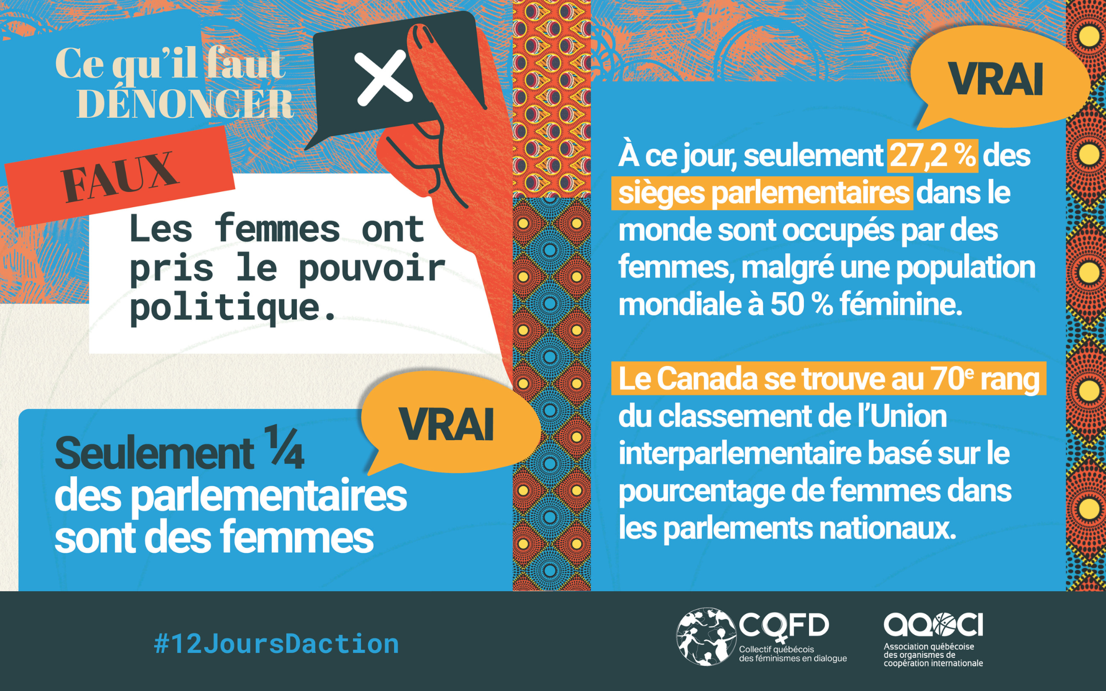 Dans les faits, seulement 26,5 % des sièges parlementaires dans le monde sont occupés par des femmes, malgré une population mondiale à 50 % féminine. L’augmentation de leur visibilité dans le monde politique peut être attribuée notamment par la volonté des partis politiques à être paritaire dans la présentation des candidat·e·s lors d’une élection et même dans la volonté d’avoir un conseil des ministres paritaire. Toutefois, lorsqu’on se penche sur la présence réelle des femmes en politique, nous pouvons réaliser que cette dernière reste encore minime. De plus, ces femmes occupent souvent des rôles de second plan au sein de ces formations politiques.