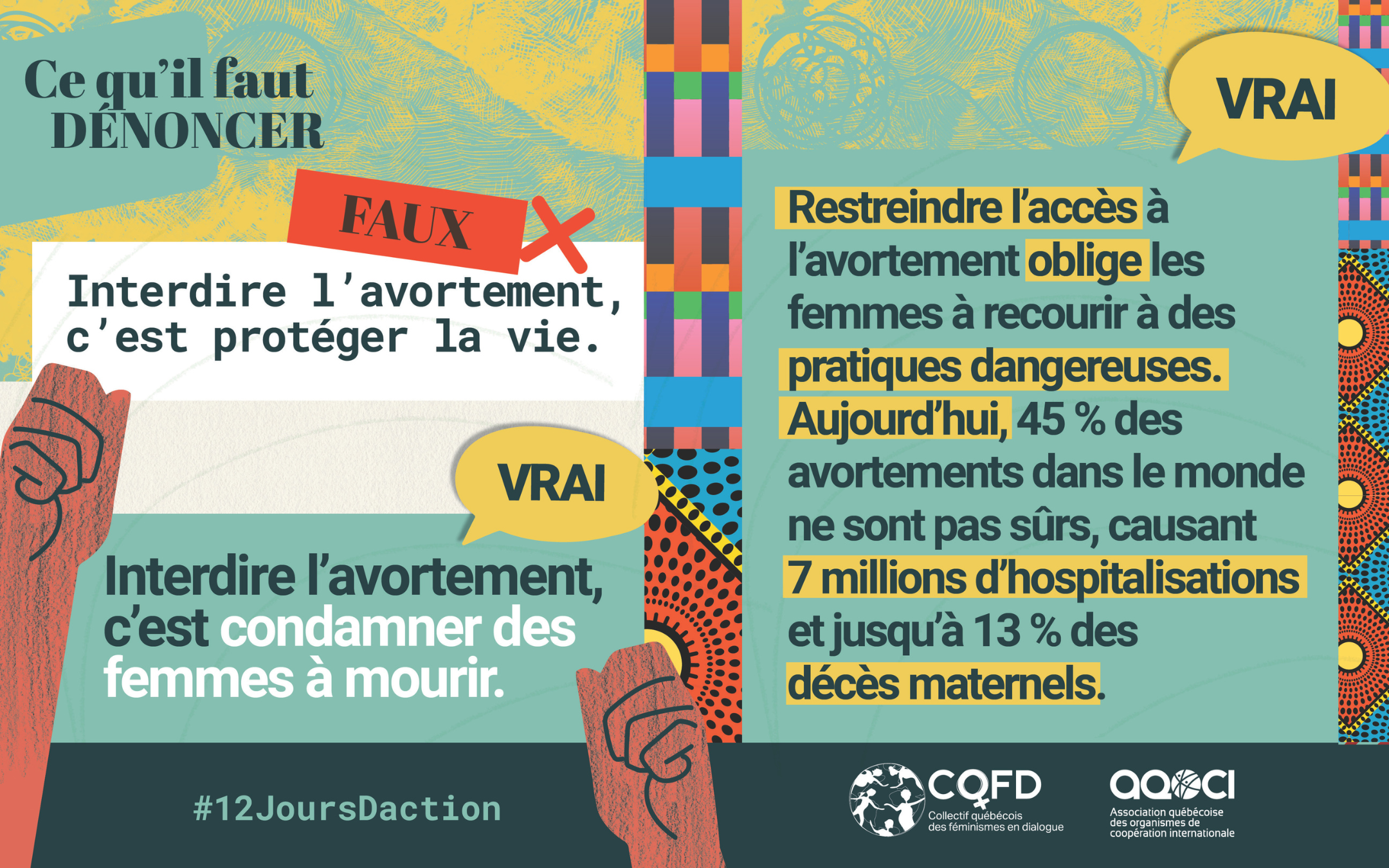 Dans les faits, interdire l’avortement, c’est condamner des femmes à mourir. La restriction de l’accès à cet acte médical pousse les personnes enceintes à se tourner vers des solutions dangereuses pour leur santé. Selon Affaires mondiales Canada, 45 % des avortements pratiqués dans le monde ne sont pas sûrs, ce qui entraîne l’hospitalisation de 7 millions de femmes par an et provoque 5 à 13 % des décès maternels. De plus, c’est près de deux tiers des femmes qui vivent dans des pays où l’accès à l’avortement est soumis à de sévères restrictions.