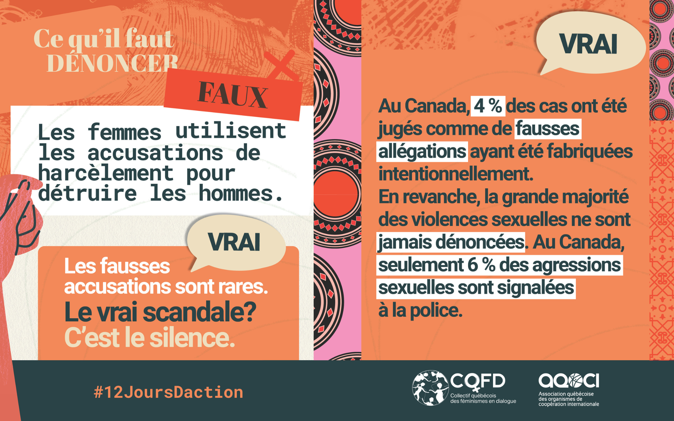 Au Canada, seulement 4 % des signalements d’agressions sexuelles ont été jugés comme de fausses allégations délibérément fabriquées. Or, cette proportion minime est trop souvent instrumentalisée pour jeter le doute sur l’ensemble des victimes. Par ailleurs, ce discours qui nie l’expérience des victimes occulte une réalité beaucoup plus lourde : la grande majorité des violences sexuelles ne sont jamais dénoncées. Au Canada, seulement 6 % des agressions sexuelles sont signalées à la police. Cette statistique s’explique en partie par le fait que les institutions de justice sont mal adaptées pour accueillir ce type de plainte et, surtout, pour offrir une véritable réparation aux plaignantes.
