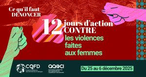 Du 25 novembre au 6 décembre, le Collectif québécois des féminismes en dialogue de l’AQOCI lance une campagne de sensibilisation les médias sociaux pour les 12 jours d’action contre les violences faites aux femmes.