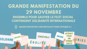 À l’appel du Mouvement d’éducation populaire et d’action communautaire du Québec (MEPACQ), un large contingent communautaire sera formé afin de rappeler que la justice sociale, ici comme ailleurs, passe par une société civile forte, libre et reconnue. Rejoignons-le pour faire entendre nos voix et porter les valeurs de solidarité internationale au cœur de cette mobilisation majeure.