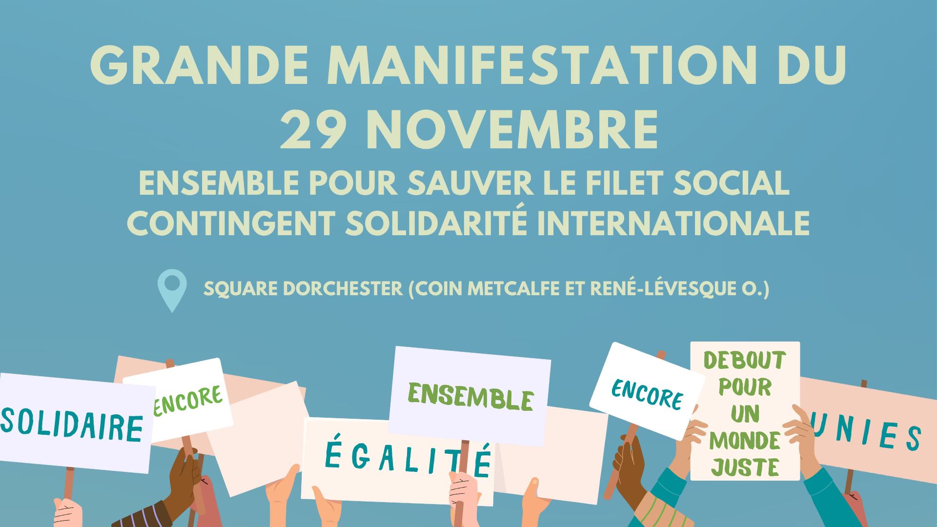 Le samedi 29 novembre 2025, Montréal accueillera une grande manifestation réunissant les mouvements communautaire, syndical, étudiant et citoyen pour défendre le filet social québécois. Dans ce contexte, l’AQOCI invite ses membres, allié·es et partenaires à se joindre au contingent Solidarité internationale.