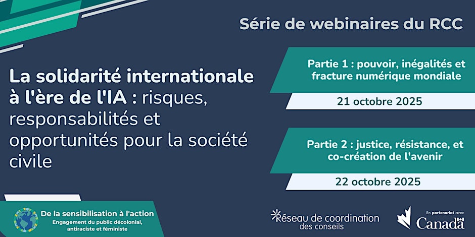 Participez à la première partie de ce webinaire en deux volets organisé par le Réseau de coordination des conseils, où nous explorerons les implications mondiales de l’IA à travers le prisme de la justice et de la solidarité. Cette séance permettra d’examiner l’héritage du colonialisme numérique, la concentration du pouvoir de l’IA dans le Nord global, et comment la société civile peut résister aux modèles extractifs pour promouvoir des avenirs inclusifs et éthiques. Avec des intervenant·es du Canada et du Sud global, nous analyserons ce que signifie la solidarité dans le contexte de la gouvernance de l’IA et de la coopération internationale.